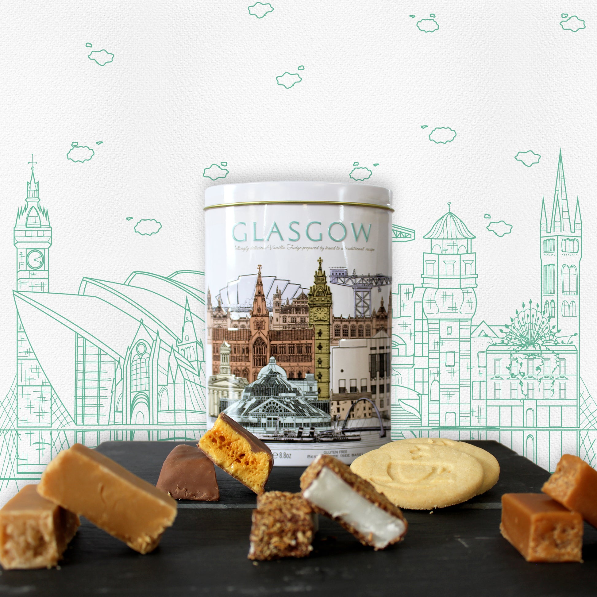 This beautiful decorative tin proudly illustrates some of Glasgow’s finest landmarks from the Botanic Gardens to the Trongate, the Clyde Crane, Waverley Steam Boat and so much more. Whether you are a local resident or a tourist who has fallen in love with Glasgow and its culture, this decorative tin is the perfect something to take home and is made complete with our meltingly delicious vanilla fudge.
