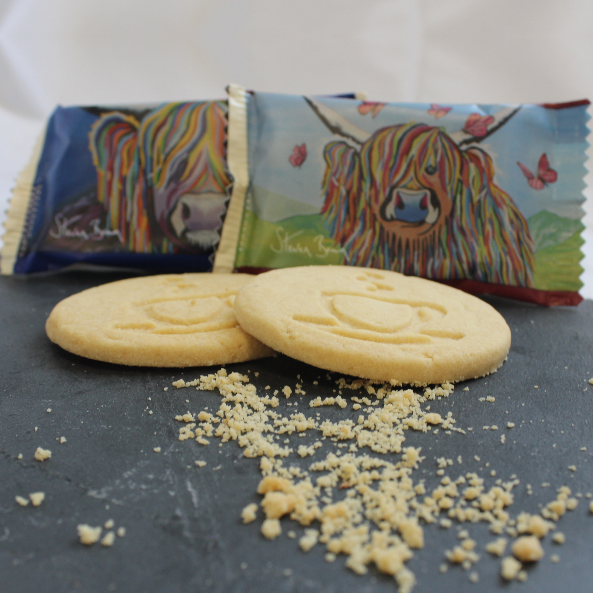 Included in the gift hamper, is a taste of Scotland; Gardiner's Traditional Handmade Tablet, Macaroon, Chocolate Covered Honeycomb, and Dean's all butter shortbread rounds presented in a stunning Steven Brown art-designed packet featuring his famous McCoo's.